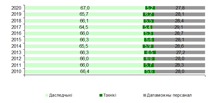Структура персаналу, занятага навуковымі даследаваннямі і распрацоўкамі, па катэгорыях
