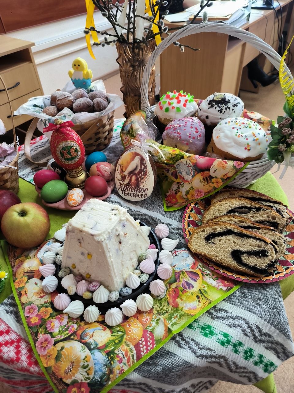 В честь светлого праздника Пасхи сотрудники Главного управления города Минска приняли участие в теплой и душевной акции «Кулич в каждый дом». Конечно, было много угощений, тематических украшений, бабушкиных рецептов и рушников. Знаменательно, что такое мероприятие организовано в Год белорусской женщины. Каждой хозяйке рекомендовалось не только поделиться изысканным рецептом, но и похвастаться своим мастерством и уж конечно получить одобрение коллег. Мероприятие, прошло в дружественной атмосфере радости и торжества жизни над смертью.