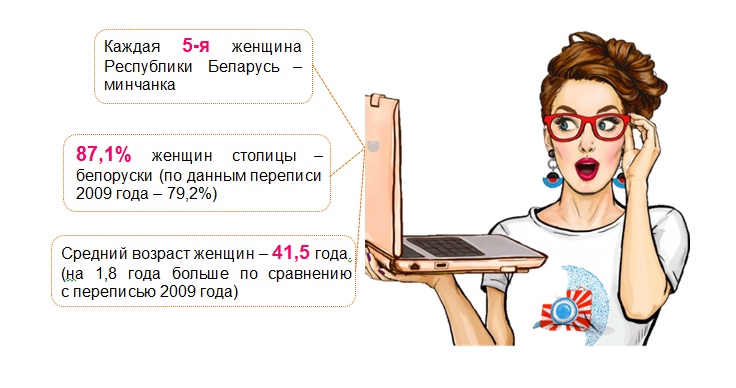По данным переписи населения 2019 года, более 950 тыс. женщин столицы отнесли себя к белорускам (87,1% от общей численности женского населения города Минска), 84,3 тыс. женщин (7,7%) назвали себя русскими и 18,3 тыс. (1,7%) – украинками. Треть столичных женщин разговаривают дома на белорусском языке, 64,9% женщин – на русском языке.