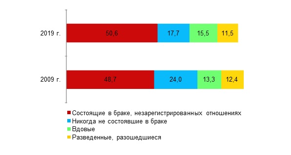 Средний возраст женщин при вступлении в первый брак в 2019 году составил 27,2 года, при вступлении в повторный брак – 38,5 года.