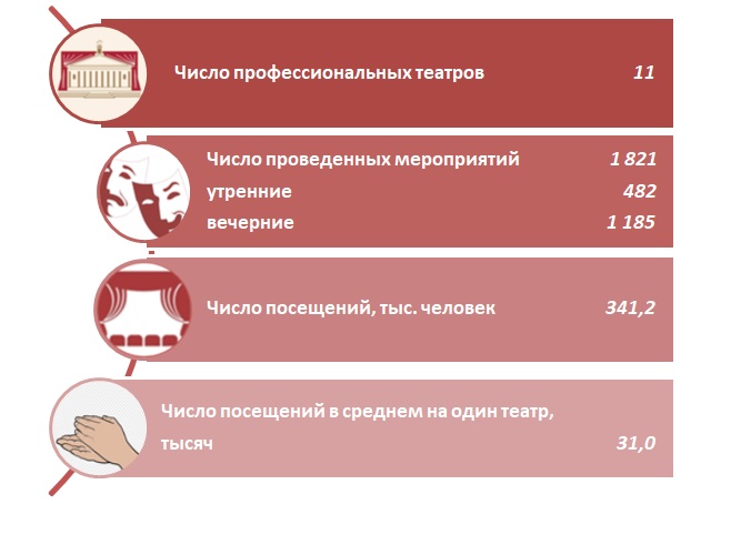 В 2020 году профессиональными театрами было поставлено 82 детских спектакля бегущего репертуара (21,9% от всего репертуара театров). Для детей представлено 12 новых постановок.
