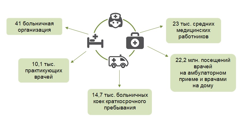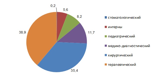 Самой многочисленной группой среди практикующих врачей в 2019 году были специалисты терапевтического профиля – 4,7 тыс. врачей, хирургического профиля – 4,3 тыс. врачей и медико-диагностического профиля – 1,4 тыс. человек.