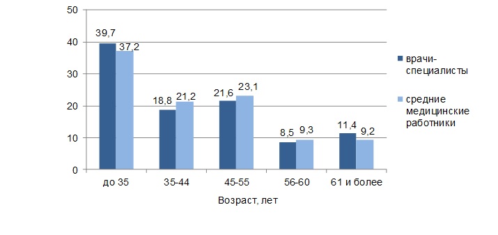 Распределение врачей-специалистов и средних медицинских работников по основным возрастным группам