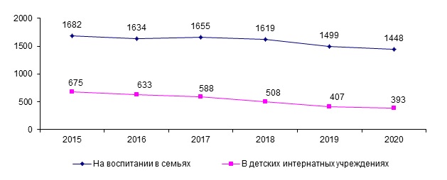 Значительное внимание со стороны государства и общества в целом уделяется вопросам защиты детей, оставшихся без родительской опеки. На начало 2021 года из 1 841 ребенка-сироты в семьях воспитывалось 1 448 (78,7%), в детских интернатных учреждениях – 393 (21,3%).