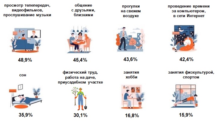 По данным выборочного обследования домашних хозяйств по уровню жизни, в 2020 году почти половина мужчин в возрасте 16 лет и старше предпочитали отдыхать, просматривая телепередачи, видеофильмы и слушая музыку.