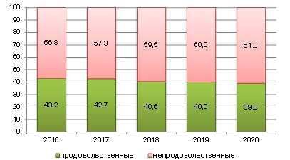 В структуре розничного товарооборота в течение пяти лет из года в год увеличивается доля продажи непродовольственных товаров, которая стабильно превышает 50%. Так по итогам 2020 года на их долю пришлось 61% от розничного товарооборота города (в 2016 году – 56,8%).