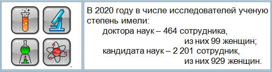 Научными исследованиями и разработками занимались 11,5 тыс. исследователей. Возраст каждого четвертого исследователя не превышал 30 лет. Каждый пятый исследователь имел ученую степень.